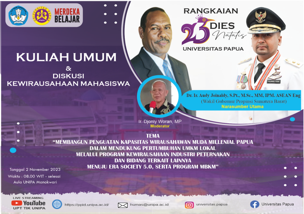 Rencananya Kuliah umum akan dilaksanakan pada hari Kamis (2/11) di Aula Utama Unipa. Nama lengkap dan beserta gelar Wakil Gubernur Sumatera Barat adalah Dr. Ir. H. Audy Joinaldy, S,Pt, M.Sc, M.M. IPM. ASEAN.Eng Datuak Rajo Pasisia Alam, Rencananya akan berada di Manokwari Papua Barat pada hari Rabu (1/11).