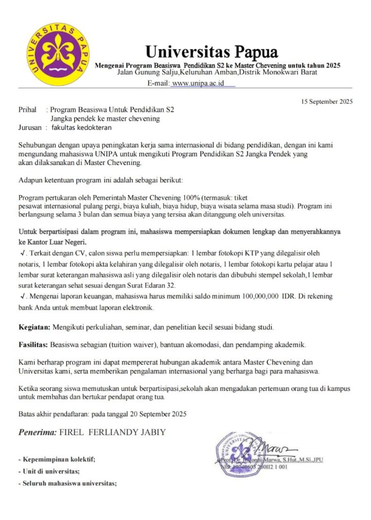 Manokwari, Papua Barat. www.unipa.ac.id  – Universitas Papua (Unipa) menegaskan bahwa surat yang beredar mengenai Program  Beasiswa untuk Pendidikan S2 Jangka Pendek ke Master Chevening Jurusan, Fakultas Kedokteran, yang di keluarkan tanggal 15 September 2025, ditandatangani oleh Wakil Rektor Bidang Akademik dan Kemahasiswaan, Prof. Jonni Marwa, adalah tidak benar. Surat tersebut tidak pernah dikeluarkan oleh Unipa.