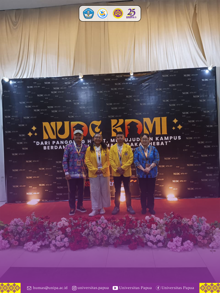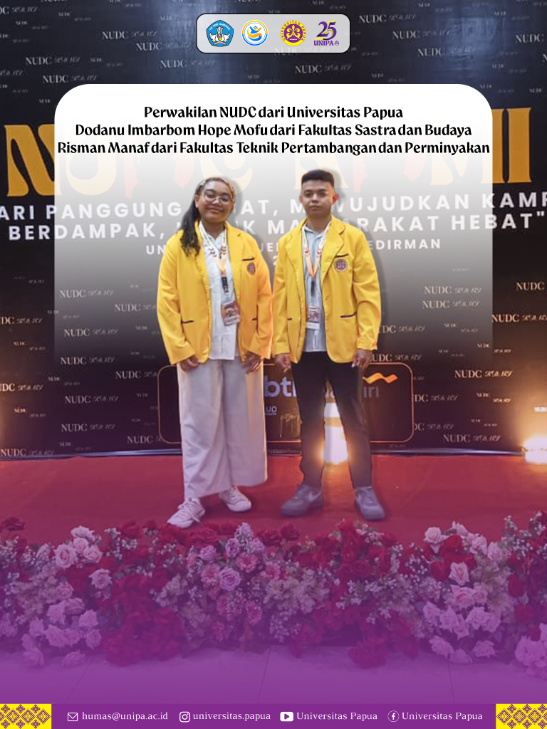 “Melalui kegiatan NUDC, UNIPA hadir memberi warna ke-Indonesiaan dari Timur Indonesia sebagai perekat nasional dan karakter bangsa bagi sesama pilar bangsa di perguruan tinggi yang berdedikasi, beradab, dan berilmu untuk kemanusiaan. Tunjukkan kemampuan dan raihlah kemenangan demi kejayaan UNIPA untuk Indonesia dari Timur Indonesia.” Pesan sekaligus motivasi dari Prof. Dr. Hugo Warami, S.Pd., M.Hum. selaku Rektor Universitas Papua.